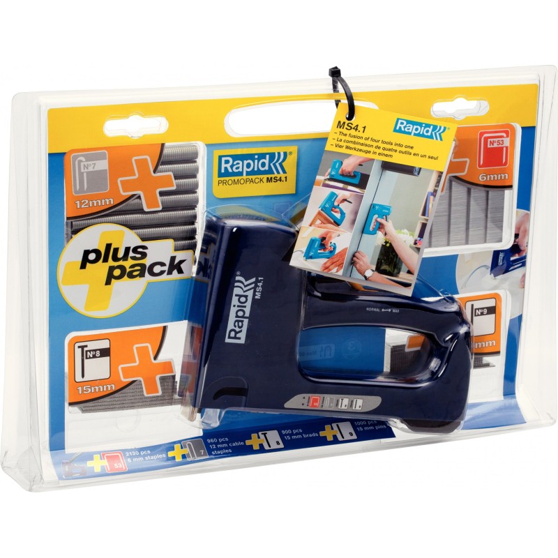 Zestaw zawierający wyjątkowo efektywne rozwiązanie 4 w 1. Zszywacz, dzięki prostej regulacji może być wykorzystywany do tradycyjnego zszywania, mocowania kabli lub jako sztyfciarka. Zawiera również 4 rodzaje dopasowanych łączników. Idealny do obijania mebli, mocowania cieńszych płyt czy tablic, a także kabli niskiego napięcia. Uniwersalny magazynek na zszywki z cienkiego drutu 53 (6-12mm), zszywki do kabli 7 (12-14mm), sztyfty 8 (15mm) oraz szpilki 9 (15mm). 2-stopniowa regulacja siły bicia umożliwia dopasowanie do rodzaju zszywanego materiału oraz długości używanych zszywek, zaś konstrukcja nosa umożliwia pracę w trudno dostępnych miejscach. Mechanizm wykonany ze stali a korpus z wytrzymałego tworzywa ABS. Ergonomiczny uchwyt z funkcją blokady ułatwiającą przechowywanie. Wyprodukowany w Szwecji, 3 lata gwarancji.