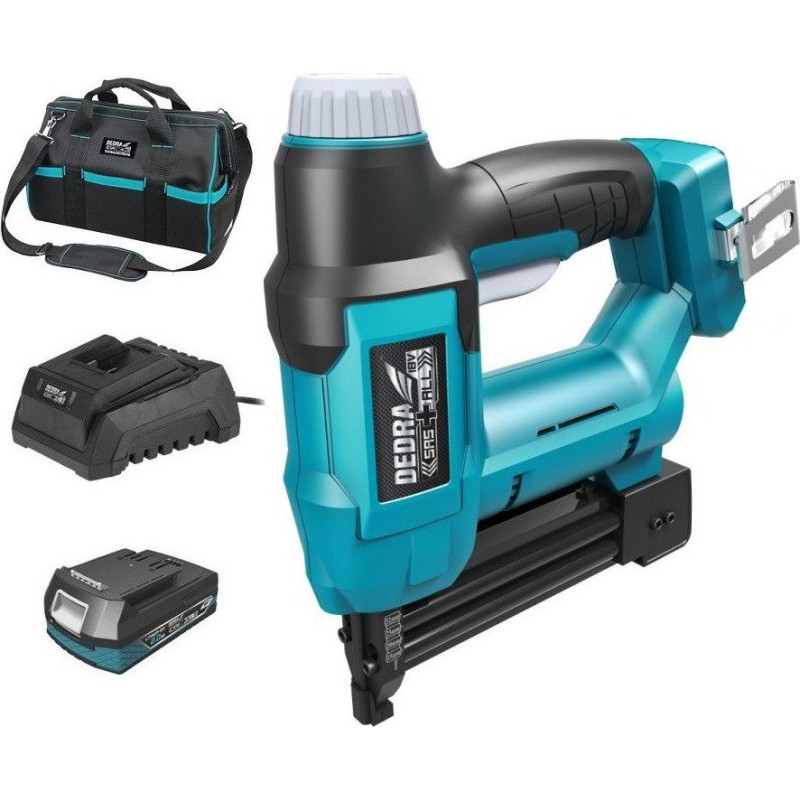 Akumulatorowy zszywacz Dedra DED7012 to urządzenie 2w1, które jest przystosowane do łączenia elementów za pomocą zszywek lub gwoździ. Narzędzie należy do linii SAS+ALL 18V, która obejmuje elektronarzędzia zasilana tym samym akumulatorem litowo-jonowym 18V. Zszywacz posiada regulację siły wbijania, oświetlenie miejsce pracy i zaczep do paska. Cechuje się poręczną konstrukcją. W zestawie DED7012 znajduje się akumulator 18V 2,0Ah, ładowarka i torba transportowa.
