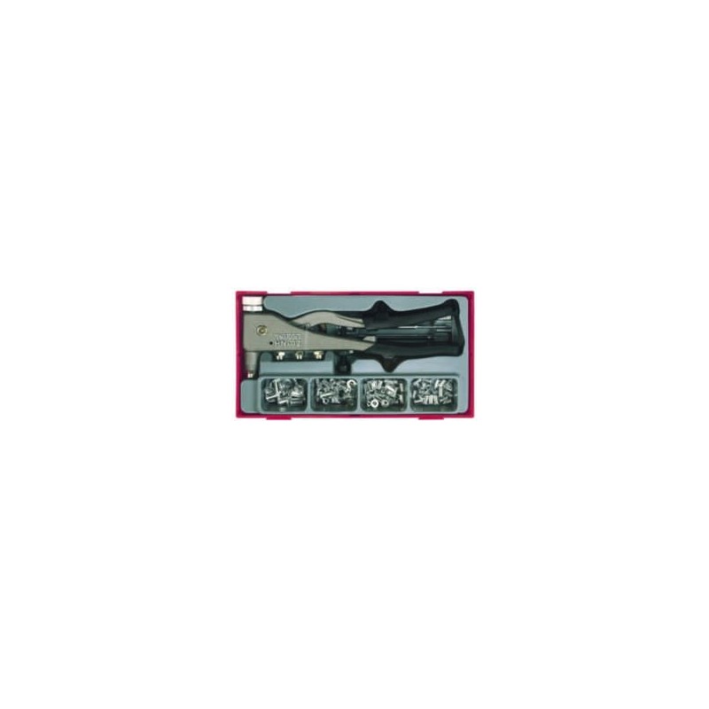 - Zestaw zawierający narzędzie do montażu nitonakrętek o rozmiarach M 3, M 4, M 5 i M 6, oraz po 20 szt. nakrętek każdego rozmiaru. Dostarczane w pojemniku tworzywowym z odłączaną pokrywą. Pasuje do skrzynek i wózków narzędziowych Teng Tools.