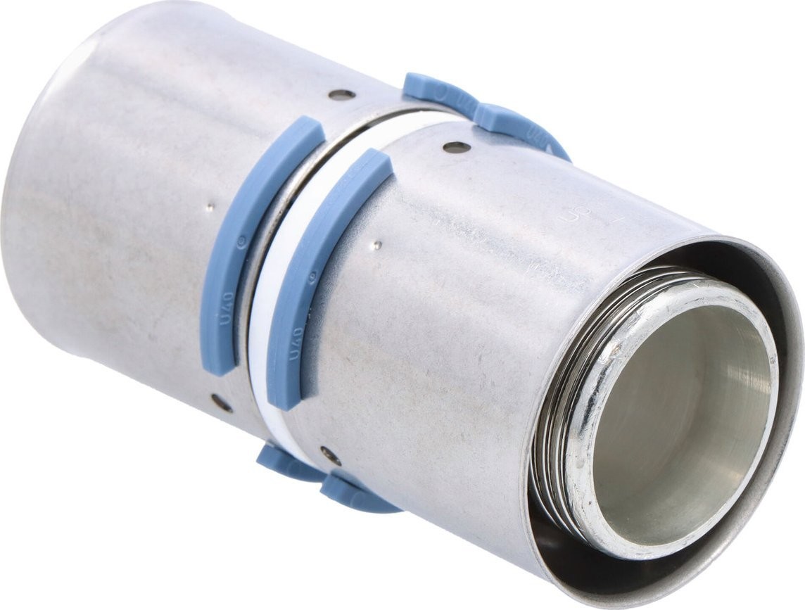 Uponor Press złączkaWykonana z mosiądzu powlekanego cyną, z przymocowanymi tulejami zaciskowymi, kolorowe pierścienie oporowe oraz test próby szczelności.