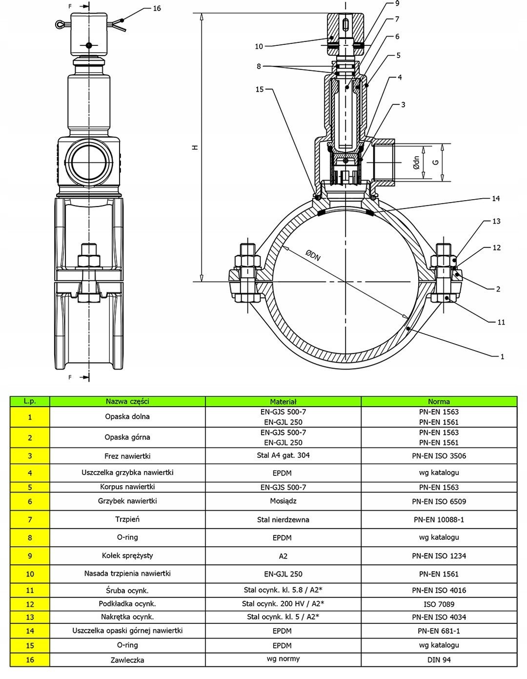 Nawiertka wykonana jest z żeliwa szarego gatunku EN-GJL-250, co zapewnia jej wysoką trwałość oraz odporność na korozję. Dodatkowo, powłoka epoksydowa o grubości minimum 80 μm zwiększa jej żywotność, co czyni ją inwestycją na długie lata.