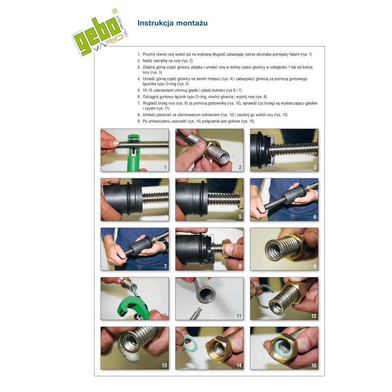 - Szczelność i niezawodność połączenia gwarantuje pierscień stalowy montowany za kołnierzem oraz nakrętki i uszczelki z serii Gebo Super Vario.