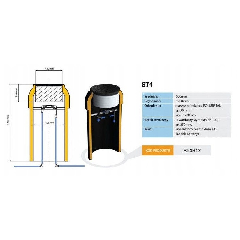 Studnia wodomierzowa ST4 DN500 H1200 została wyposażona w płaszcz ocieplający z poliuretanu o grubości 50 mm, co skutecznie zapobiega zamarzaniu wodomierza. Dzięki temu, możliwe jest umiejscowienie wodomierza około 30 cm pod pokrywą, co zapewnia dodatkową ochronę przy temperaturach sięgających nawet -30°C.