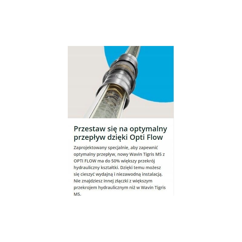Zaprojektowany specjalnie, aby zapewnić optymalny przepływ, nowy Wavin Tigris M5 z OPTI FLOW ma do 50% większy przekrój hydrauliczny kształtki. Dzięki temu nowa instalacja będzie charakteryzować się jeszcze większą wydajnością i niezawodnością. Nie ma na rynku innej złączki zaciskanej z większym przekrojem hydraulicznym niż Wavin Tigris M5.