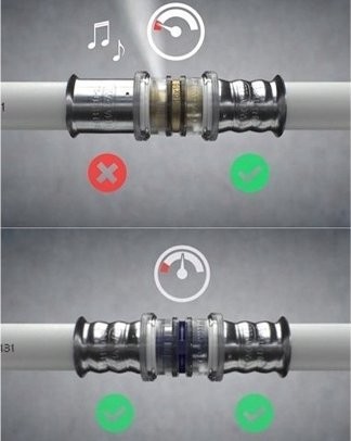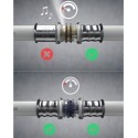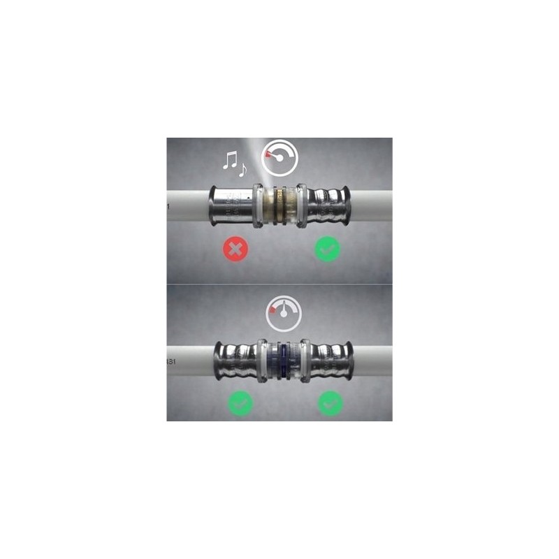 Funkcja, która w prosty sposób umożliwi instalatorom szybkie sprawdzenie całej instalacji i wykrycie niezaciśniętych kształtek podczas prób ciśnieniowych wykonywanych sprężonym powietrzem. Dzięki ACOUSTIC LEAK ALERT każda niezaprasowana kształtka emituje głośny dźwięk gwizdka (80 dB), co sprawia, że jej odnalezienie jest niezwykle proste. Daje to absolutną pewność, że cała instalacja zostanie prawidłowo złożona. Jednak jeżeli próba ciśnieniowa instalacji będzie przeprowadzana za pomocą wody, niezaciśnięte połączenia zostaną ujawnione dzięki doskonale znanemu systemowi DLF. W takim przypadku wystąpi kontrolowany wyciek, dzięki czemu łatwo będzie zlokalizować pominięte zaciski i naprawić błąd.