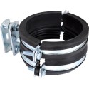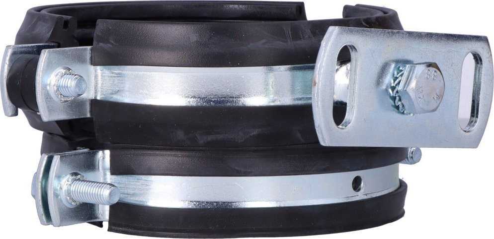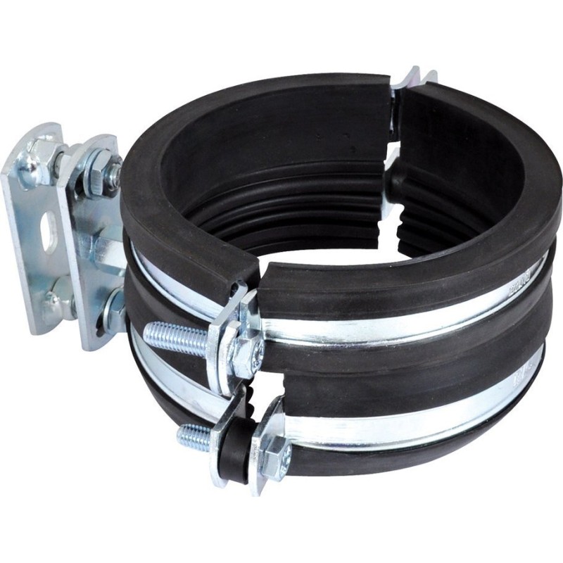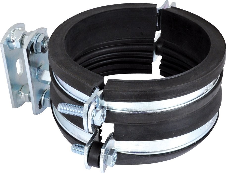BISMAT 1000 Zestaw obejm do mocowania pionów, regulowana płyta ścienna z obejmami podtrzymującą BISMAT SL i mocującą BISMAT SX w komplecie; konstrukcja służąca do montażu pionowych rur z tworzyw sztucznych, stalowych i żeliwnych, montaż co drugie piętro, jeżeli wysokość piętra nie przekracza 3 m (od średnicy rur 125 mm, na każdym piętrze budynku), mocowanie pozwala uniknąć naprężeń poprzez nieograniczony zakres regulacji, możliwość ustawienia odległości pomiędzy rurami a ścianą. Materiał: stal, ocynkowane elektrolitycznie, okładzina izolująca dźwięk: EPDM w kolorze czarnym.
