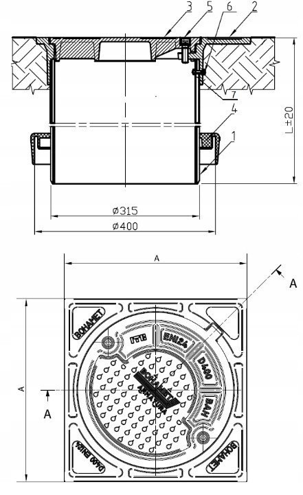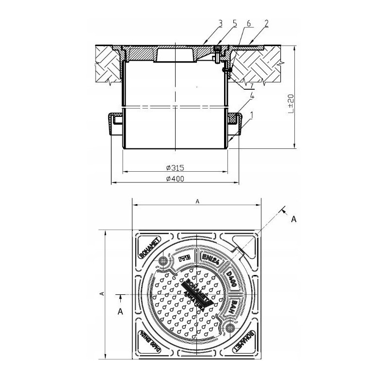 - Materiał dla pokrywy: żeliwo szare gatunek EN-GJL 250 oraz żeliwo sferoidalne gatunek EN-GJS 500-7 wg PN-EN 1563