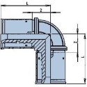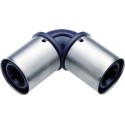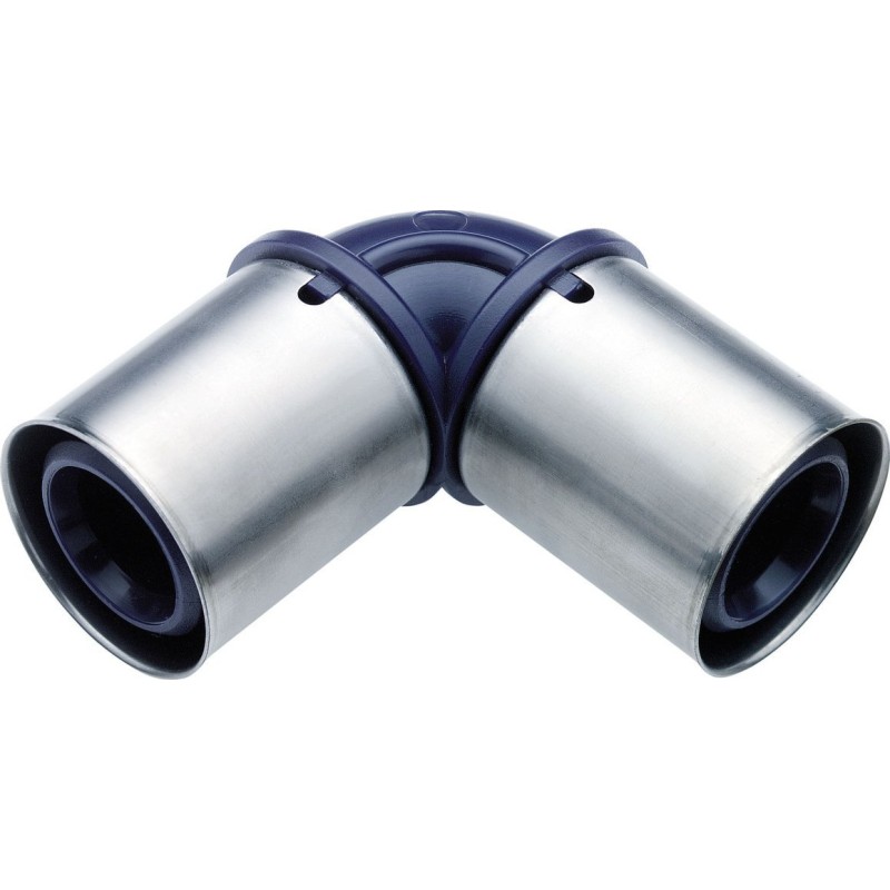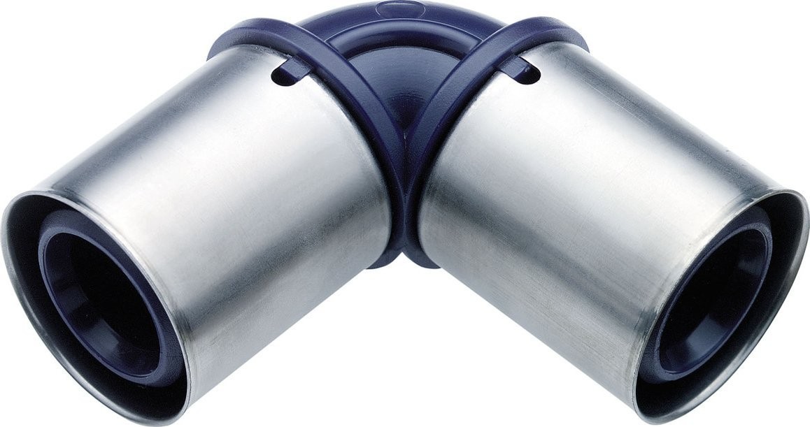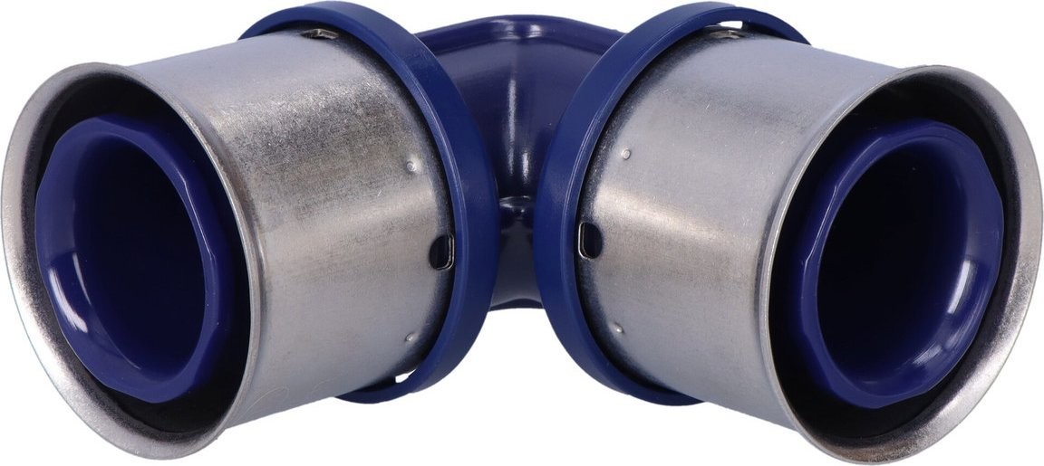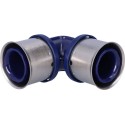 Kolano zaciskowe 90° produkowane z PPSU, wyposażone w zaciskowe obejmy ze stali nierdzewnej