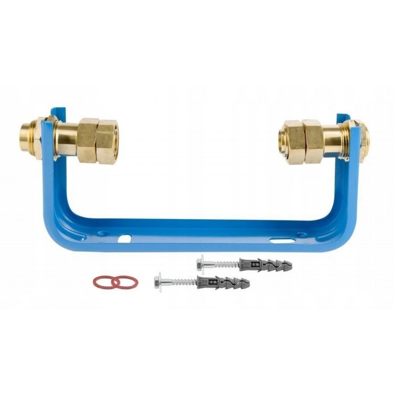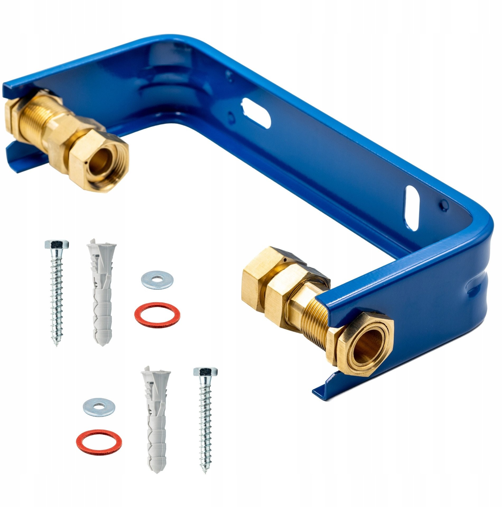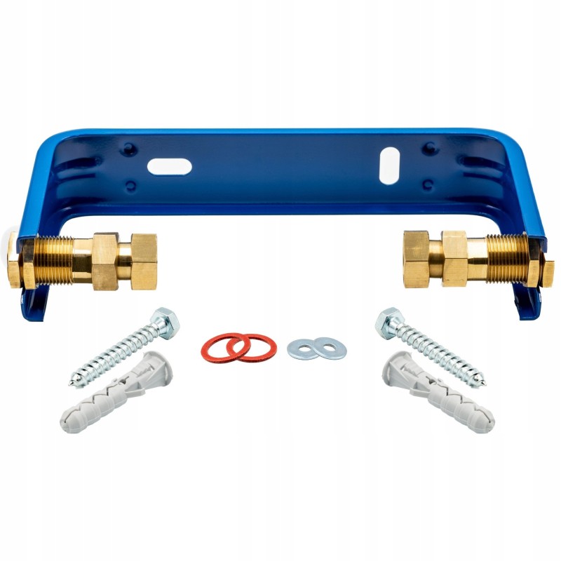 W zestawie znajduje się wszystko, co niezbędne do prawidłowego montażu: stalowy wspornik, półśrubunki mosiężne oraz zestaw montażowy, który obejmuje 2 uszczelki, 2 stalowe wkręty, 2 stalowe podkładki oraz 2 kołki. Dzięki temu instalacja staje się szybka i bezproblemowa.