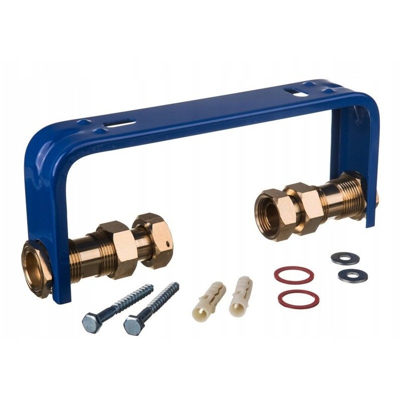 - Zawartość zestawu: wspornik stalowy, pół śrubunki mosiężne, zestaw montażowy (2x uszczelki, 2x stalowe wkręty, 2x stalowe podkładki, 2x kołki)