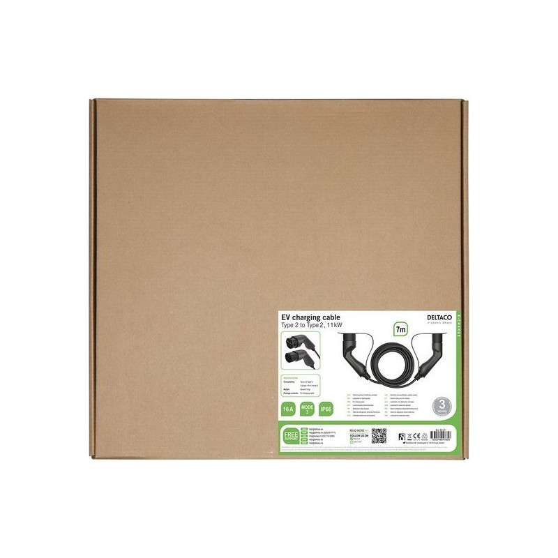Kabel ładujący Deltaco EV-3217 o długości 7 metrów zapewnia maksymalną moc ładowania 11 kW przy 16 A. Trójfazowy kabel ładujący jest wyposażony w złącze typu 2 do typu 2, co jest standardem w UE. Za pomocą tego kabla możesz ładować w większości stacji ładowania w Europie.