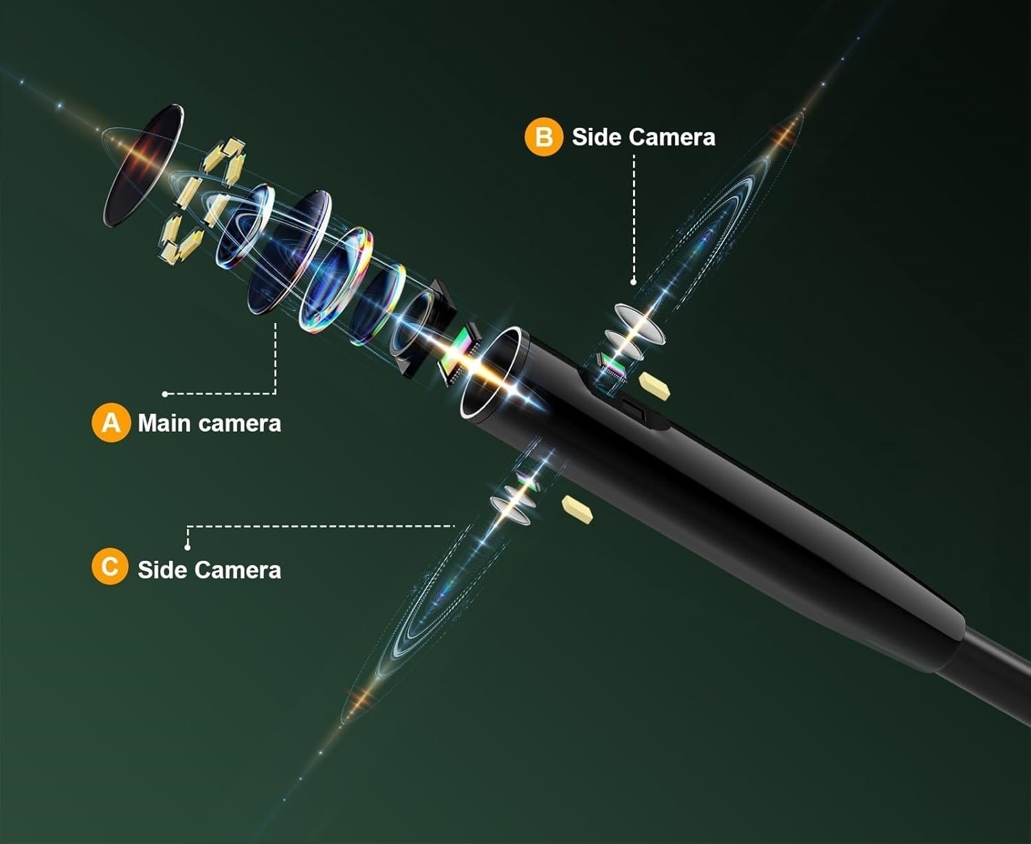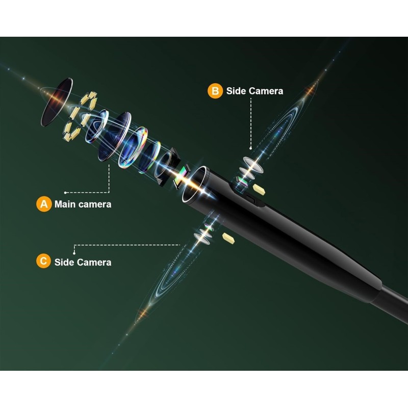 - ✅Duże pole widzenia 360° z trzema soczewkami: Kamera endoskopowa ES520 oferuje trzy soczewki, co oznacza szerokie pole widzenia 360°. Dodatkowo, dwie kamery HD znajdujące się po bokach głównej kamery zapewniają lepszy widok lewego i prawego obszaru. Możesz przełączać się między tymi trzema obiektywami, aby uzyskać lepsze wyniki obserwacji.