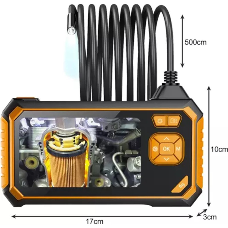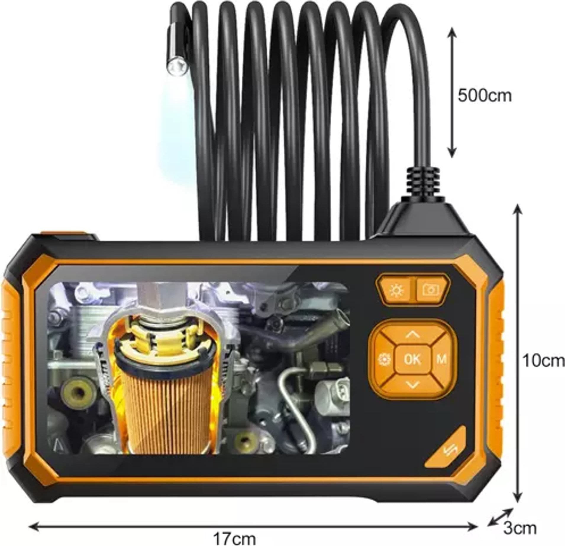 - SPECYFIKACJA - 4,3" LCD Endoskop foto i wideo FULL HD; lupa: 8mm; długość kabla: 5m; ilość pikseli: 2 miliony pikseli; wodoodporność: IP67; pojemność baterii: 1700mAh; czas ładowania: 1,5h; czas użytkowania: 3h; wymiary: 17 x 10 x 3 cm; waga: 492g; waga w opakowaniu: 616 g.