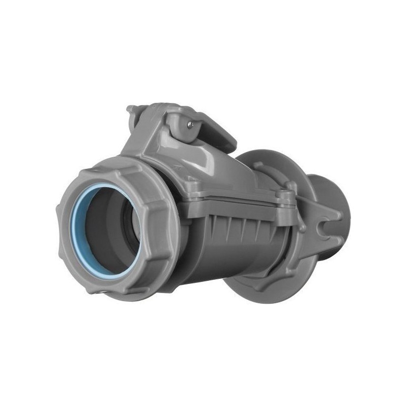 Zasuwę 50 w wersji B podłączamy do kielicha 50 kształtki znajdującej się w ścianie. Specjalna, estetyczna rozeta maskująca umożliwia przymocowanie zaworu do ściany za pomocą dwóch wkrętów. Zabezpiecza to system przed samoczynnym rozłączeniem się podczas wystąpienia w kanalizacji ciśnienia, spowodowanego wstecznym przepływem ścieków. Do tak przymocowanego urządzenia podłączamy syfon (np. umywalki), za pomocą specjalnego złącza z nakrętką.