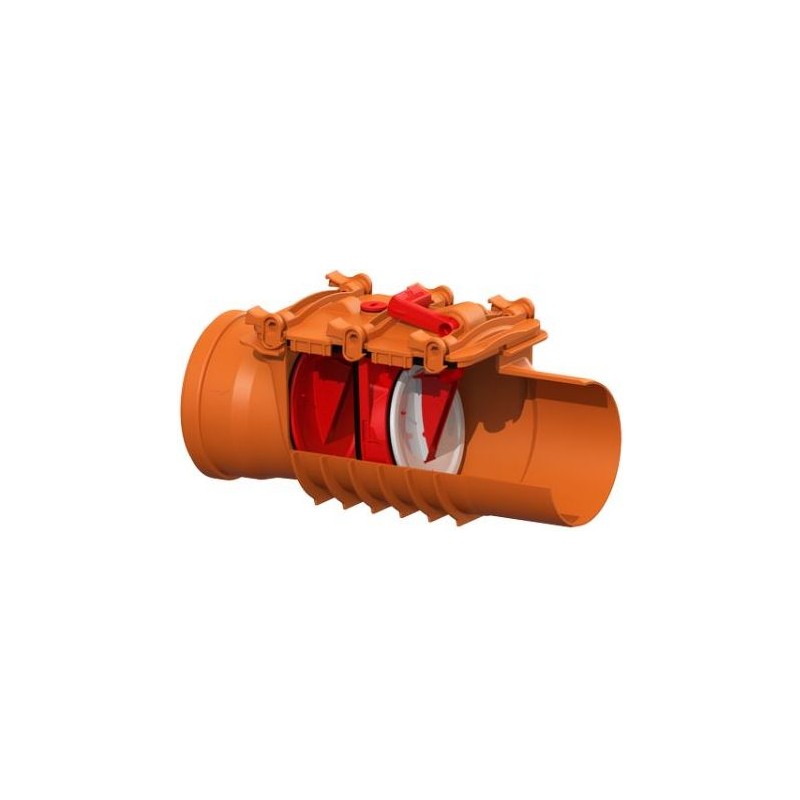do ścieków bez fekaliów, z tworzywa sztucznego. Dwie klapy samoczynnie zamykające się, jedna z nich służy jako ręczne zamknięcie awaryjne. jedna klapa z tworzywa sztucznego i jedna klapa ze stali nierdzewnej do ochrony przed gryzoniami i robactwem.