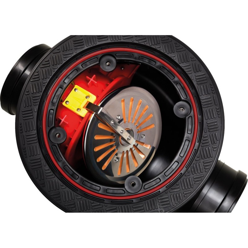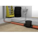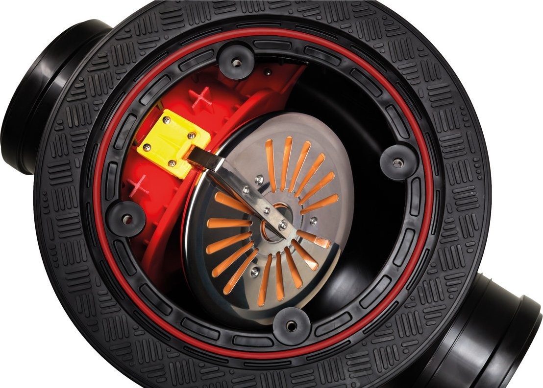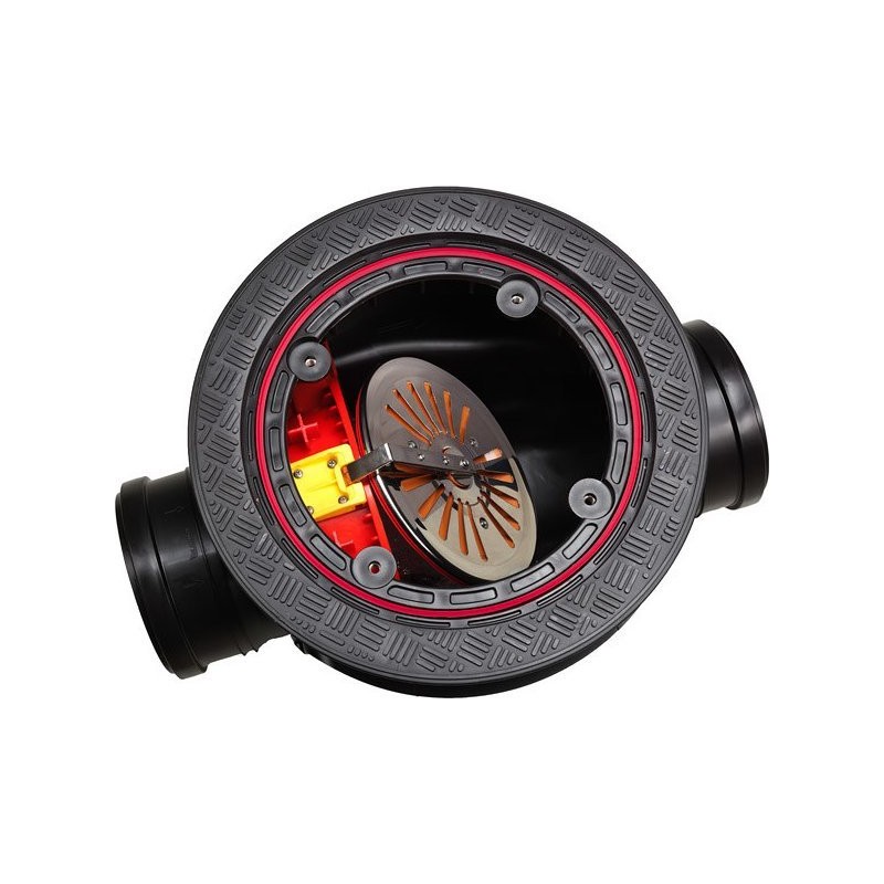 Kineta z zasuwą burzową przeznaczona do montażu w pomieszczeniach przyziemia budynku w przypadku, gdy główny odpływ kanalizacji przebiega bezpośrednio pod podłogą pomieszczeń przyziemia budynku. Kineta chroni przed przepływem wstecznym a równocześnie stanowi wygodną rewizję pozwalającą na dostęp do rurociągu. Pokrywa jest wyposażona w uszczelki i jest całkowicie szczelna.Urządzenie sprawdzi się w piwnicach, garażach, halach produkcyjnych i magazynowych. Dopuszcza się zastosowanie go na zewnątrz budynków w poziomie utwardzonych powierzchni.