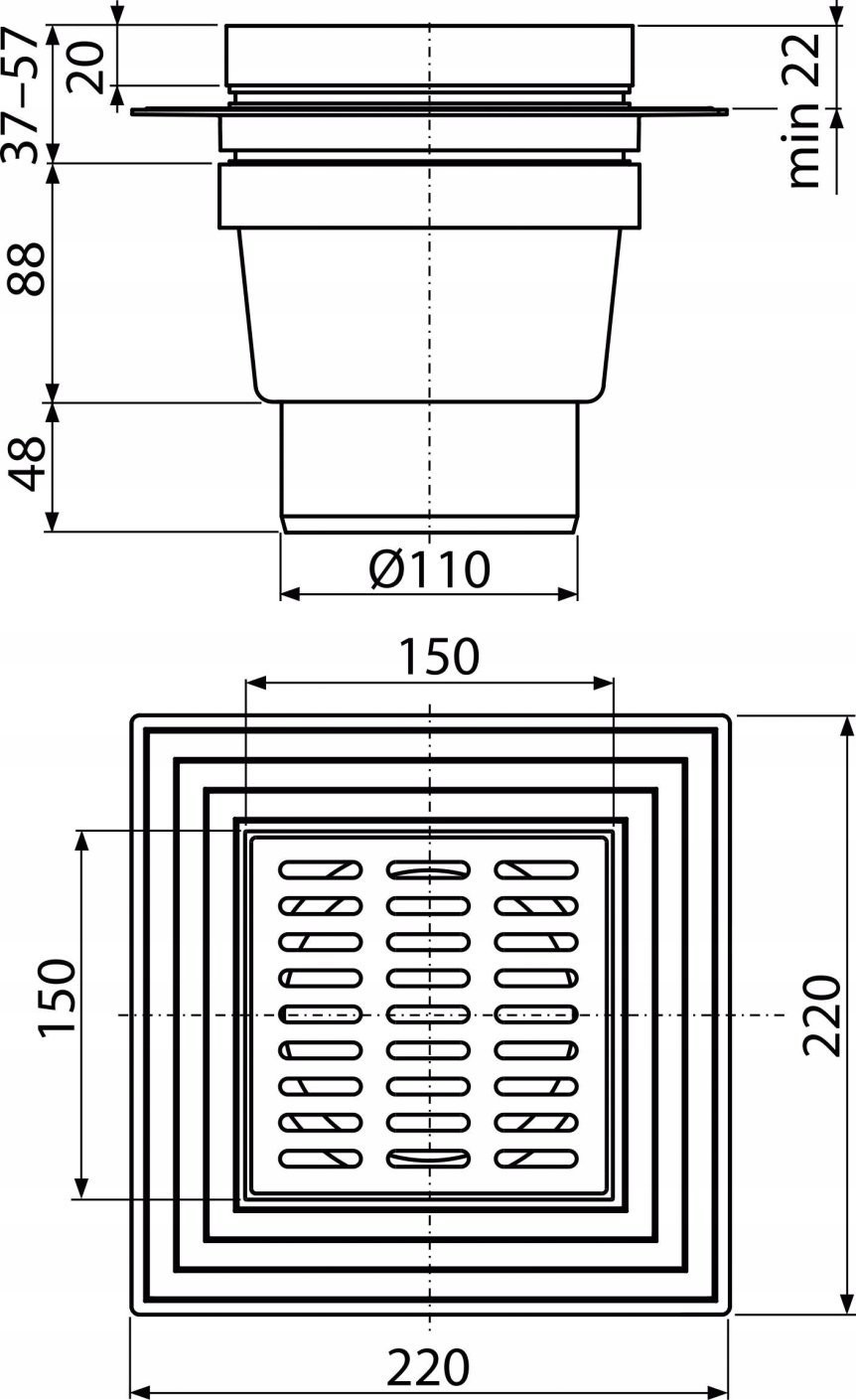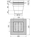 Kratka ściekowa 150×150/110 mm odpływ pionowy, kratka nierdzewna, dwa poziomy izolacji, syfon mokry