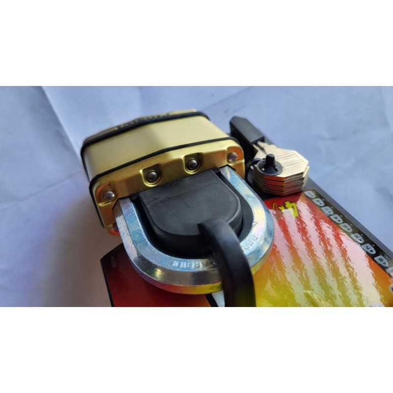 - nazwa typu elementu: Kłódka o wysokim stopniu bezpieczeństwa [zamek z kluczem] [laminowana stal i powierzchnia mosiężna] [odporna na warunki atmosferyczne [średni pałąk] – idealna do składu towarowego, warsztatów