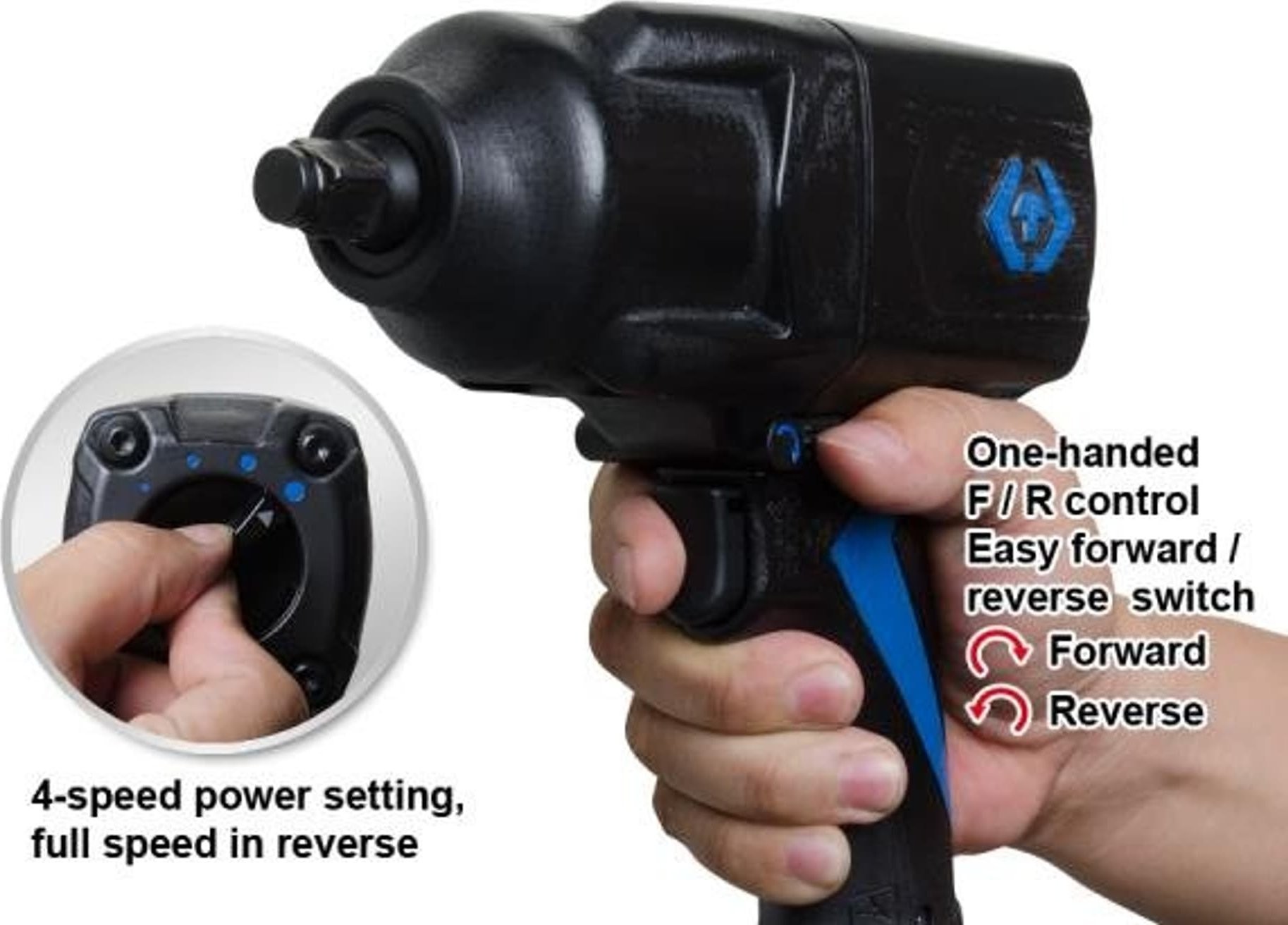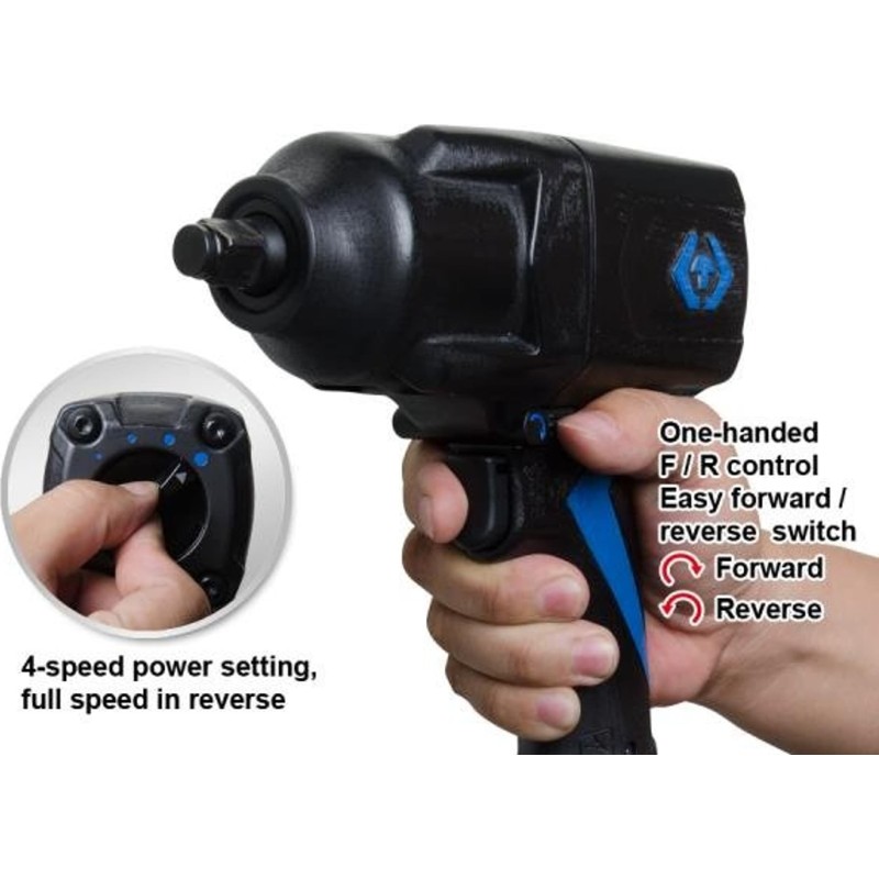 Klucz udarowy kompozytowy 3/4" King Tony. Prędkość obrotowa 8000 obrotów na minutę. Średnie zużycie powietrza 190 l/min . Maksymalny moment obrotowy 1491 Nm. Waga 2,35 kg, długość 211 mm. Karta produktu - 33681-100