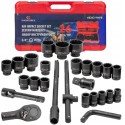 W skład zestawu wchodzą nasadki 3/4" o rozmiarach od 17 mm do 50 mm oraz nasadki 1" o rozmiarach 55 mm, 60 mm i 65 mm. Taka różnorodność pozwala na łatwe dopasowanie narzędzi do różnych zadań, co czyni zestaw niezwykle wszechstronnym.