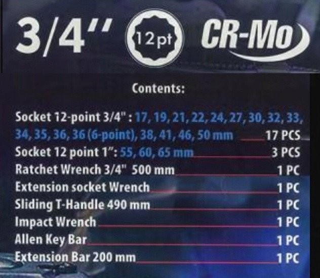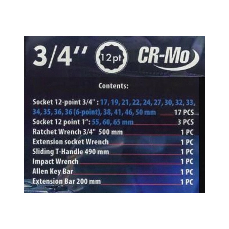 - Nasadki 3/4" 12-kątne: 17, 19, 21, 22, 24, 27, 30, 32, 33, 34, 35, 36, 38, 41, 46, 50 mm