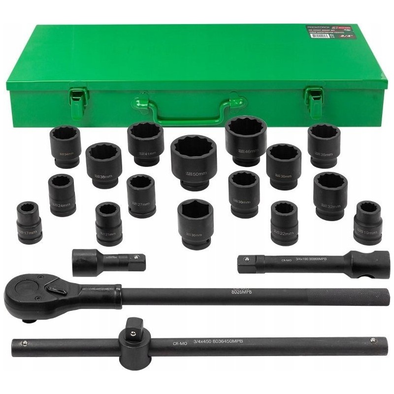 ZESTAW KLUCZY NASADOWYCH 12-Kąt Z NASADKAMI UDAROWYMI 3/4" 21EL 17-50MM WALIZKA METALOWA FIRMY ROCKFORCE.
