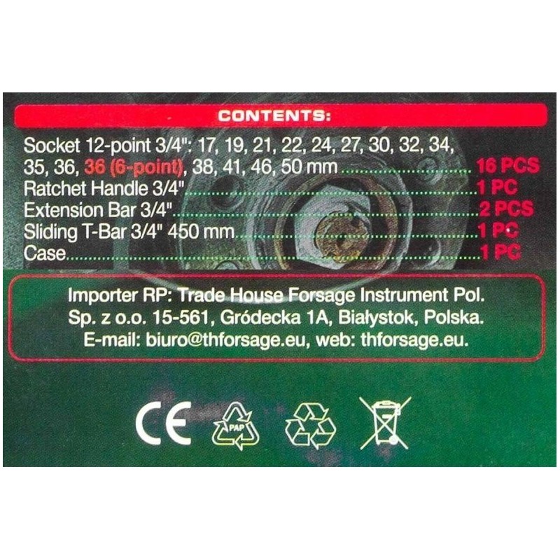- Nasadki 12-kątne 3/4" - 15 szt.: 17, 19, 21, 22, 24, 27, 30, 32, 34, 35,36, (36 mm - 6-kąt), 38 mm, 41 mm, 46 mm, 50 mm;
