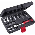 Klucze i bity w zestawie są wykonane z wytrzymałych materiałów, odporne na korozję, co gwarantuje długotrwałe użytkowanie w każdych warunkach. Zestaw zawiera wymienne głowice kluczy, bity oraz przedłużkę, co zapewnia szeroki zakres zastosowania. Walizka, w której znajdują się narzędzia, pozwala na łatwą organizację i dostępność podczas pracy.
