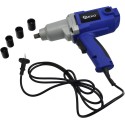 Klucz udarowy elektryczny 1/2" 800W + nasadki CrV Udarowy klucz elektryczny 1/2", w zestawie z nasadkami CrV 17, 19, 21, 22 mm. Klucz o wysokim momencie obrotowym 320 Nm i obrotach do 2200 obr/min. Zasilany elektrycznie, dlatego nie potrzebuje do pracy kompresora. Doskonale nadaje się do użycia w warsztatach samochodowych jak i w przydomowych garażach. Charakterystyka produktu: moment obrotowy na poziomie 320 Nm maksymalne obroty klucza - 2200 obr/min możliwość szybkiej wymiany szczotek węglowych trzpień klucza 1/2" w zestawie 4 nasadki wykonane ze stali CrV w rozmiarach: 17, 19, 21, 22 mm Specyfikacja techniczna: Napięcie znamionowe: 230V~50Hz Prędkość obrotowa: 2200 obr/min Moc: 800W Maksymalny moment udarowy : 320 Nm Końcówka nasadki : 1/2" Obroty: lewo/prawo Nasadki: 17, 19, 21, 22 mm Certyfikaty: CE