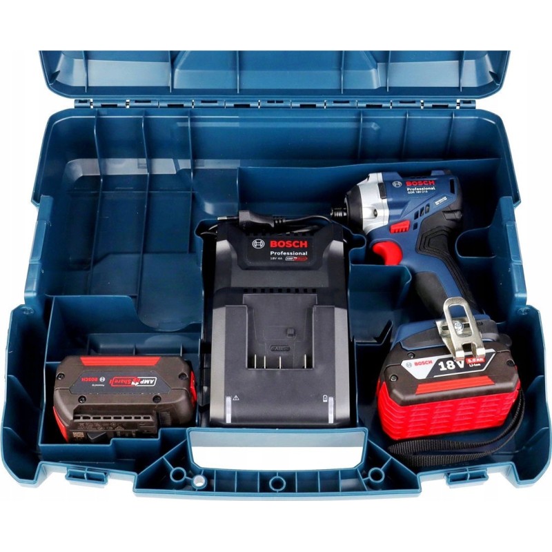 W zestawie z zakrętarką znajdują się dwa akumulatory 18V o pojemności 5,0 Ah, szybka ładowarka GAL 18V-40, zaczep do mocowania na pasku, opaska na przegub dłoni oraz walizka narzędziowa, co znacznie ułatwia transport i przechowywanie.