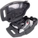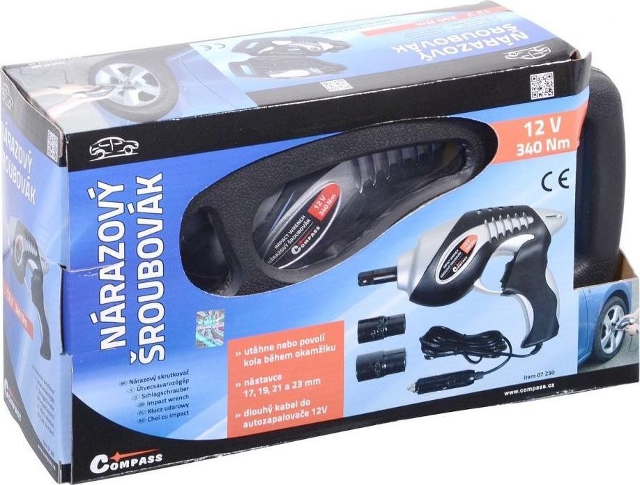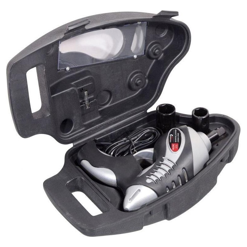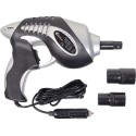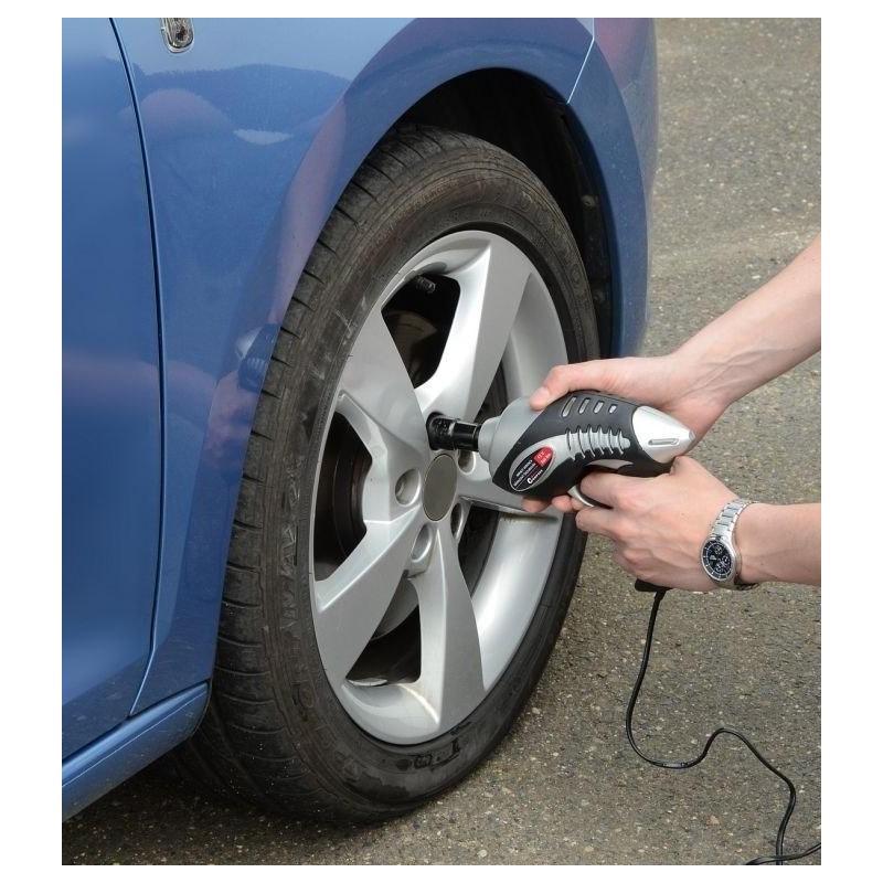 Wkrętarka udarowa z wtyczką do gniazda zapalniczki samochodowej 12 V przeznaczona jest do odkręcania i dokręcania nakrętek lub śrub kół. Jest dostarczany w zamykanej plastikowej obudowie i zawiera wymienne nasadki ze stali chromowo-wanadowej. Długi kabel pozwala na wygodne dokręcenie wszystkich kół pojazdu.