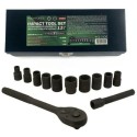 - Zawartość zestawu: 10 nasadek udarowych (10, 11, 12, 13, 14, 17, 19, 22, 23, 24 mm), 1 przegub udarowy 1/2", 1 grzechotka udarowa