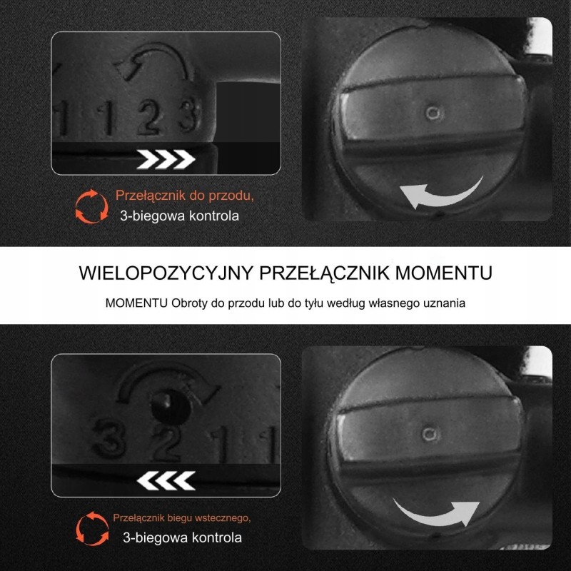 Połączony przełącznik do przodu/do tyłu i zarządzania energią, 6-stopniowe ustawienia do regulacji prędkości i momentu obrotowego w celu dostosowania do różnych zastosowań.