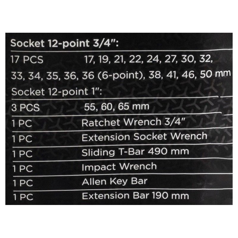 - Rozmiary kluczy nasadowych 3/4": 17-19-21-22-24-27-30-32-33-34-35-36-36(6-kątne)-38-41-46-50mm