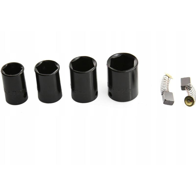 W zestawie znajdują się cztery nasadki w rozmiarach 17, 19, 21 i 23 mm, co zapewnia wszechstronność i wygodę podczas pracy. Dzięki różnorodności nasadek, klucz udarowy może być wykorzystywany w wielu różnych zastosowaniach, co czyni go niezwykle praktycznym narzędziem.