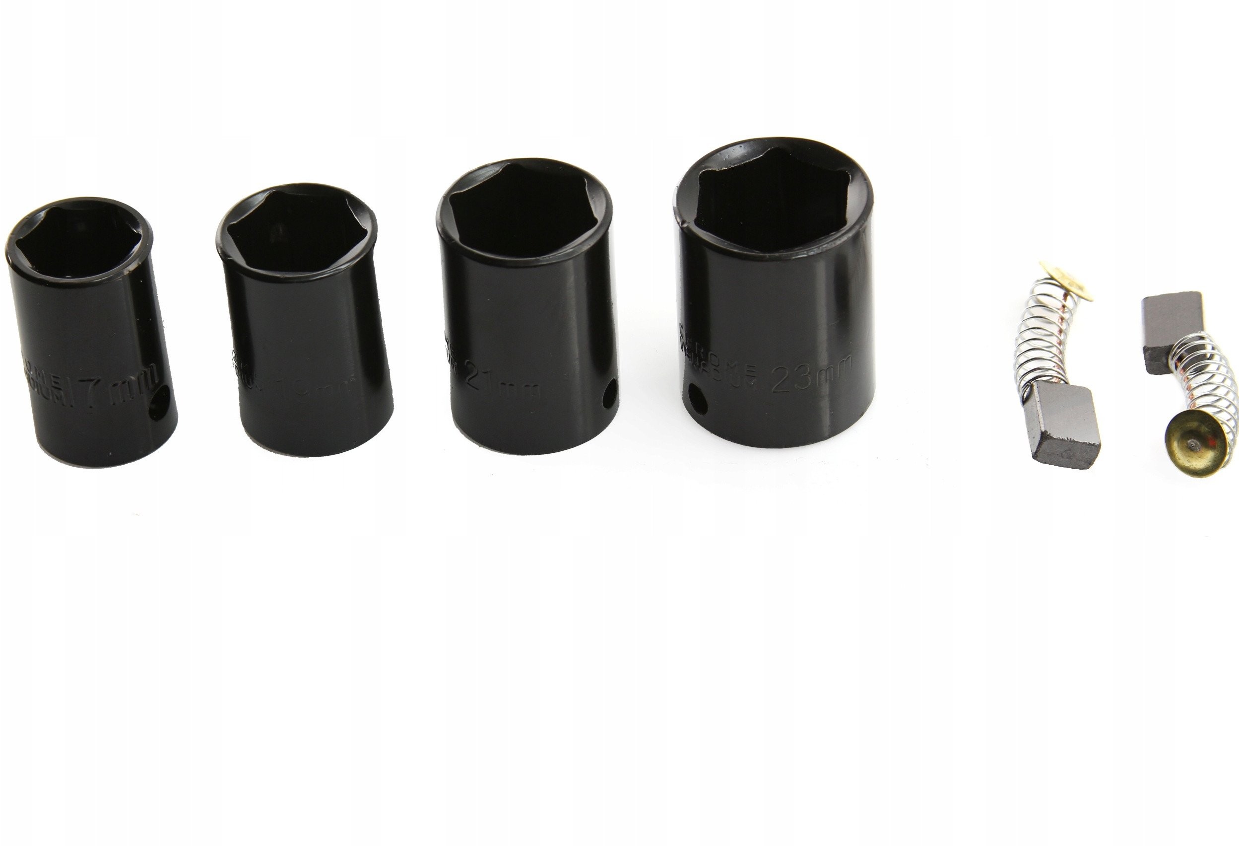 - Zawartość zestawu: klucz elektryczny udarowy, nasadki 17, 19, 21, 23 mm, zapasowe szczotki węglowe (2 szt.), plastikowa walizka, instrukcja w j.polskim