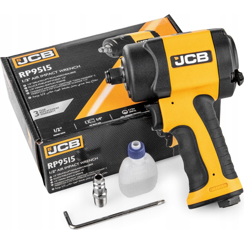 W zestawie z kluczem udarowym JCB znajduje się złączka, olej pneumatyczny oraz klucz serwisowy, co czyni go kompletnym narzędziem gotowym do użycia od razu po zakupie.