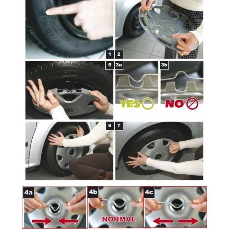 Montaż kołpaków jest niezwykle prosty i nie wymaga żadnych specjalnych narzędzi. Wystarczy zdjąć stare kołpaki, oczyścić obręcz i nałożyć nowe. Jeśli kołpak jest zbyt luźny lub zbyt ciasny, średnicę pierścienia dociskowego można łatwo dostosować.