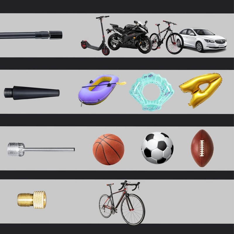 W zestawie znajdują się 3 końcówki do pompowania piłek, materacy i pontonów.