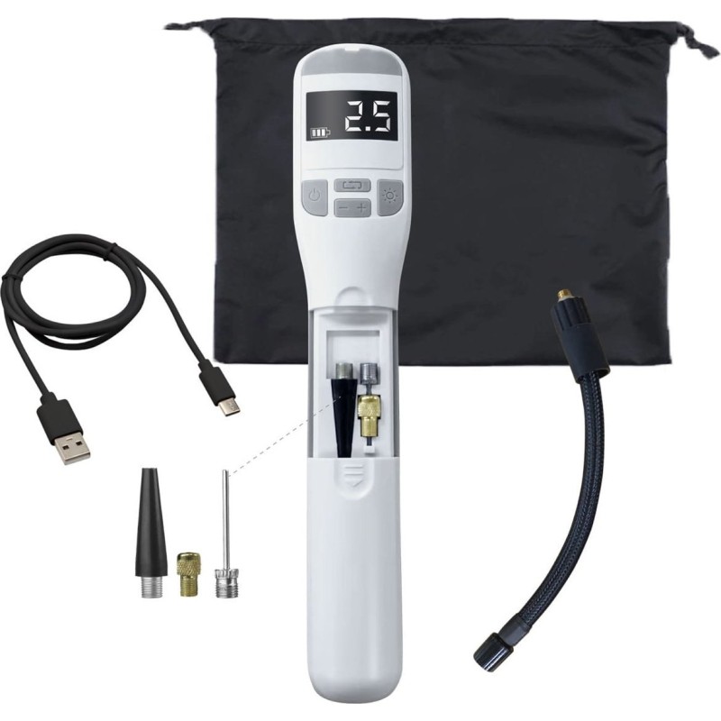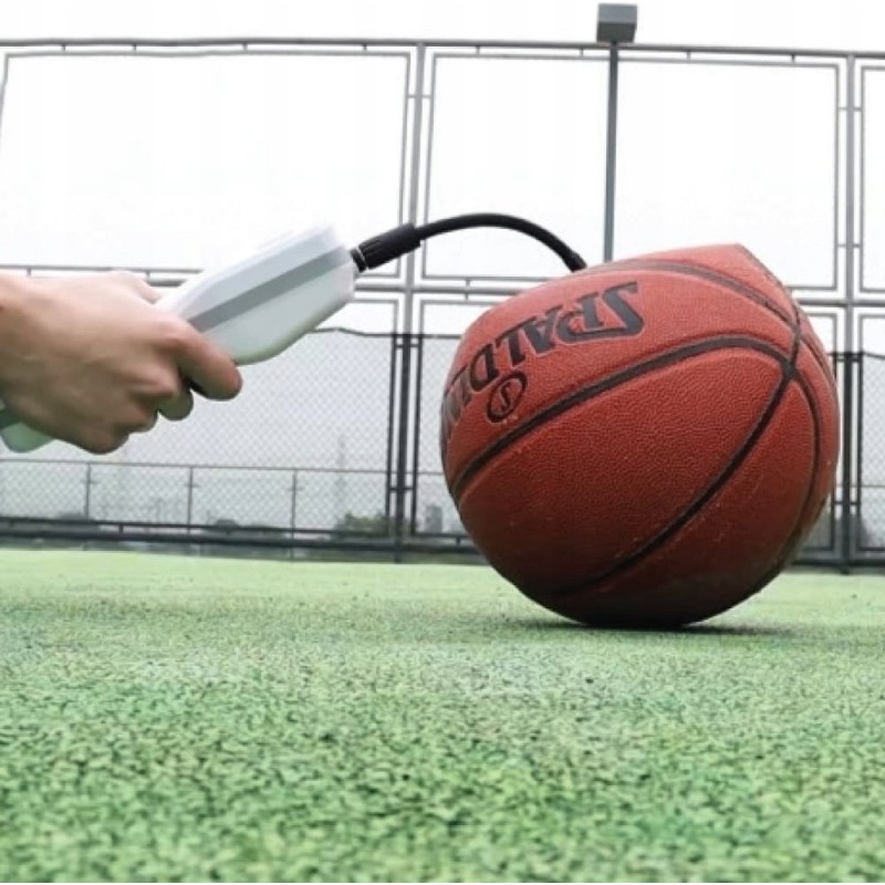 W zestawie znajduje się komplet dwóch adapterów i igły do pompowania piłek, kabel z wtyczką Type-C do ładowania, wąż powietrzny oraz wygodna torba do przechowywania.