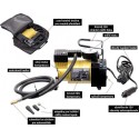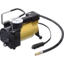 Sprężarka powietrza z manometrem. Kabel zasilający z wtyczką do gniazda zapalniczki samochodowej 12 V. Kompresor nadaje się do pompowania opon samochodów osobowych, dostawczych oraz aut typu 4 x 4. W zestawie praktyczna zamykana torba oraz dodatkowe adaptery do różnych zastosowań (piłki do pompowania, materace, ...). Dane techniczne: zasilanie: 12 - 13,5 V. pobór mocy: maks.15 A. maksymalny czas pracy: 10 minut maksymalne ciśnienie: 9 kg / cm2 (BAR); 140 PSI rozładowanie: 35 l / min długość przewodu zasilającego 12V: 270 cm Zawartość opakowania: 1 x kompresor