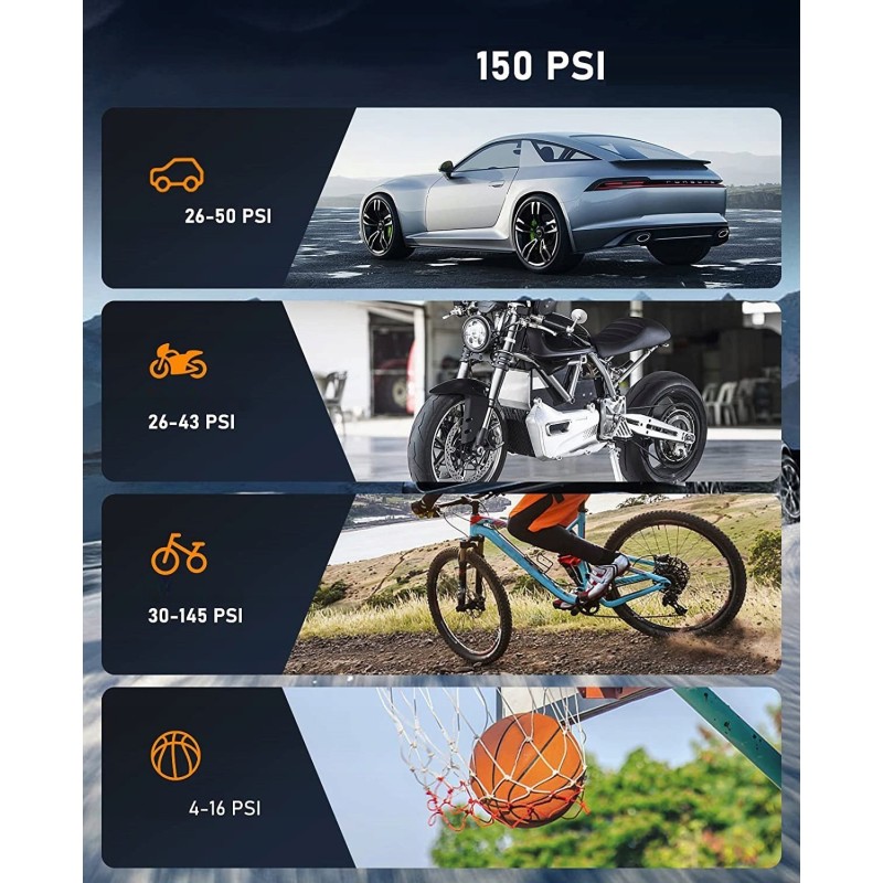 Pompka potrafi szybko napompować opony przy maksymalnym ciśnieniu 150 PSI i przepływie powietrza 34 l/min. W ciągu zaledwie 1 minuty pompka może napompować oponę od 25 do 36 PSI, a w ciągu 5 minut całkowicie napompować oponę samochodową od 0 do 36 PSI. Idealnie nadaje się do pompowania samochodów, motocykli, hulajnóg, rowerów, piłek i innych przedmiotów nadmuchiwanych.
