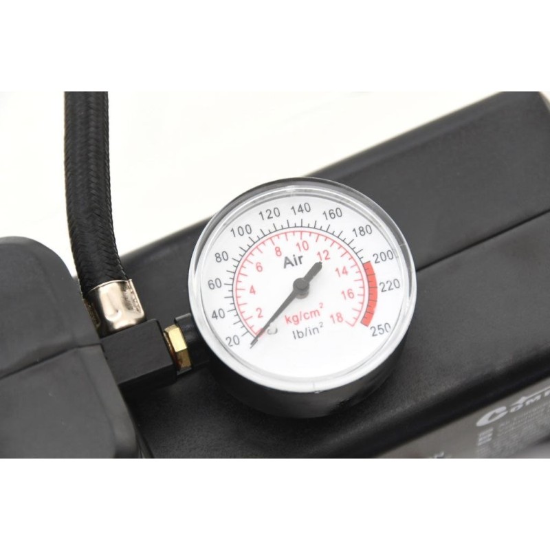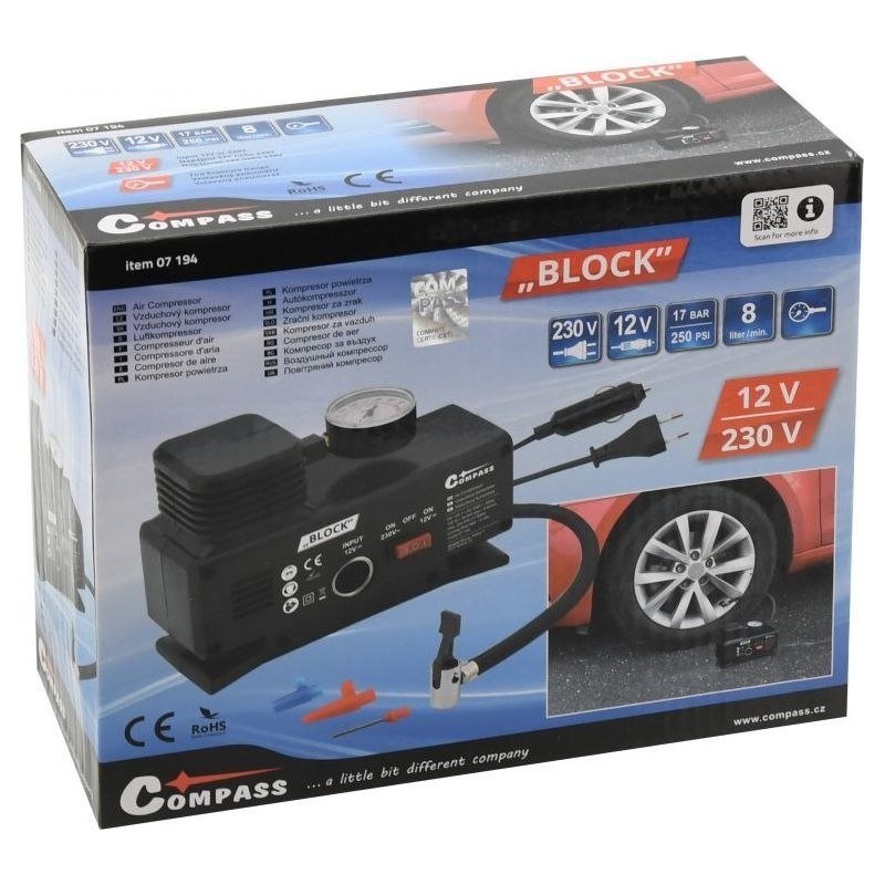 Wysokowydajna sprężarka powietrza z zasilaniem 12 V / 230 V. Kable zasilające i węże do pompowania mają wystarczającą długość 12 V - 260 cm / 230 V - 150 cm oraz wąż 0,5 m. Sprężarka jest wyposażona we wbudowany miernik pneumatyczny wyświetlający zmierzone ciśnienie w kilku jednostkach.