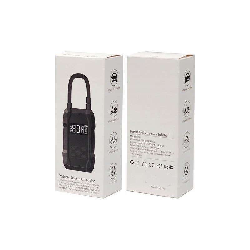 Elektryczna pompka przenośna WEKOME Pi801 to proste i funkcjonalne urządzenie, które każdy motywowany powinien mieć w swoim bagażniku. Urządzenie zostało wyposażone w wyświetlacz oraz przyciski sterujące, które kontrolują proces pompowania. Na wyświetlaczu można śledzić aktualne ciśnienie w oponach, a za pomocą przycisków można je regulować. W zestawie wielofunkcyjnym znajdują się również dysze do pompowania piłek, rowerów i motocykli. Dodatkowo ta mała i bardzo funkcjonalna pompka może też służyć jako power bank, dzięki czemu można naładować baterię w smartfonie. Cechy produktu:· Materiał: ABS+PC· Pojemność: 2000mAh/3.7V(14.8Wh)· Zakres ciśnienia: 0,2-10,3 Bar· Cyfrowy wyświetlacz· Wejście interfejsu: USB-C· Kompaktowe, trwałe i przenośne· Automatyczne zabezpieczenie przed przegrzaniem· Silnik szczotkowy· Rozmiar: 152x104x46mm· Waga: 573gWEKOME Pi801 - Przenośna elektryczna pompka samochodowa + Power Bank 2000 mAh