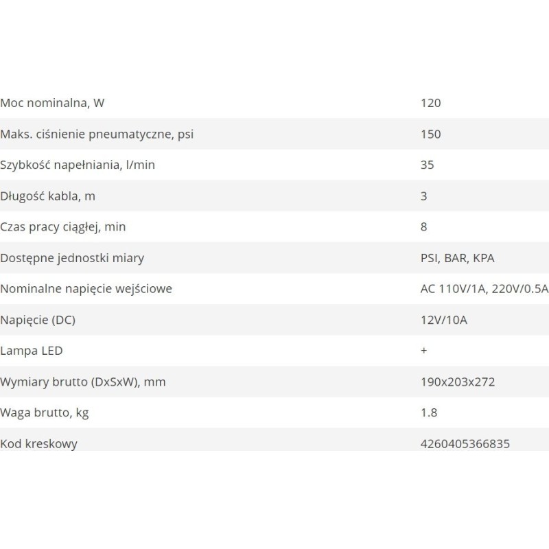 Wyposażony w funkcję autostopu - automatyczne przerwanie dostaw powietrza po osiągnięciu określonych parametrów. Posiada kabel o odpowiedniej długości - 3 m dla większej wygody użytkowania.