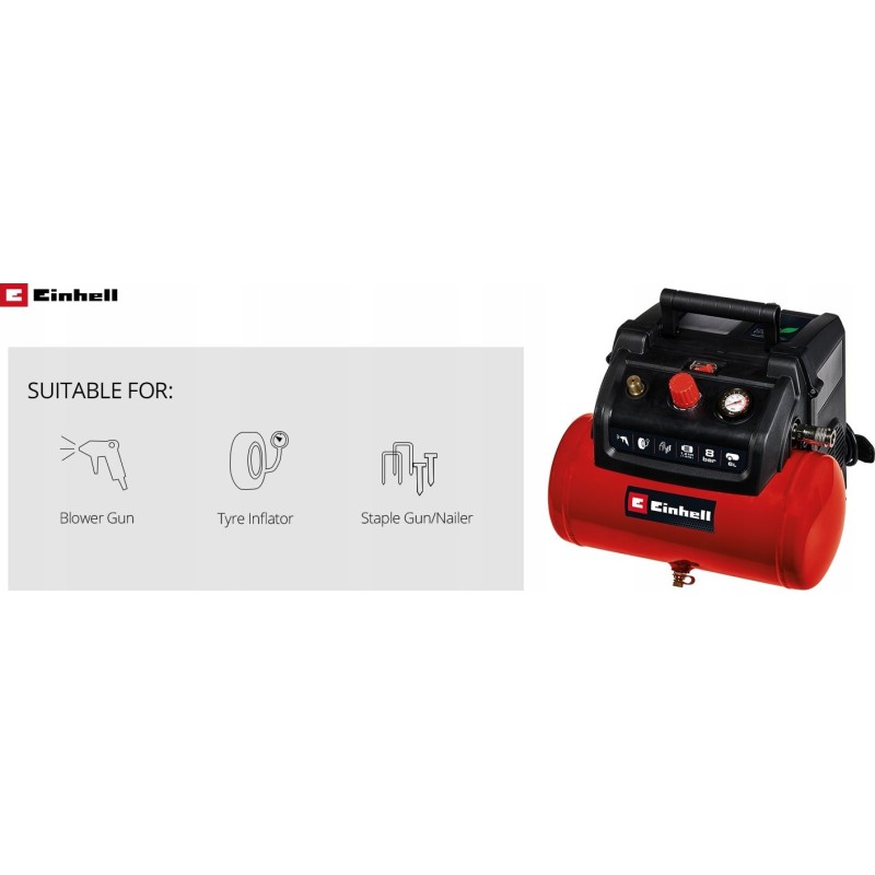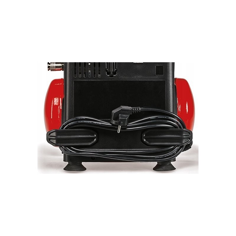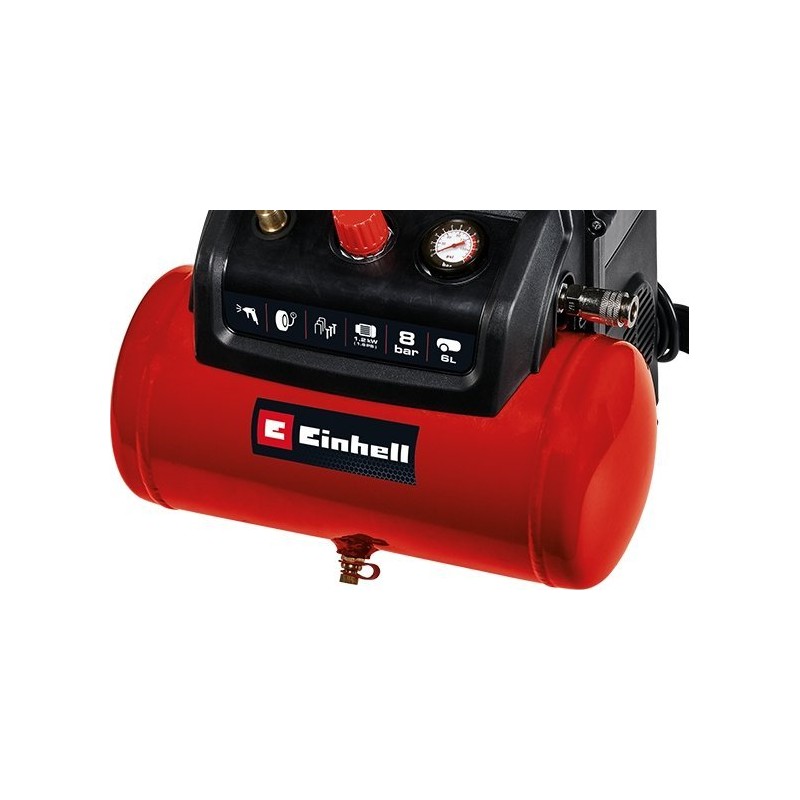 Posiada 6-litrowy zbiornik sprężonego powietrza, zwijacz kabla z tyłu obudowy oraz hak i schowek na akcesoria. Reduktor ciśnienia regulowany do 8 barów umożliwia dostosowanie do różnych zadań. Zawiera manometr, szybkozłączkę i nóżki zapewniające stabilność podczas użytkowania. Bezpieczeństwo użytkowania gwarantuje zawór bezpieczeństwa oraz korek spustowy ułatwiający konserwację. Einhell oferuje 10-letnią gwarancję na rdzewienie bojlera.