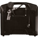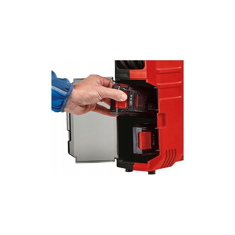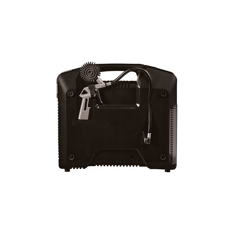 Bezolejowa, bezobsługowa pompa wymaga niewielkiej konserwacji. Schowek na wąż sprężonego powietrza jest zintegrowany z obudową. Miernik ciśnienia w oponach można wygodnie schować na obudowie. Zestaw nie zawiera baterii ani ładowarki, są one dostępne do zakupienia osobno.