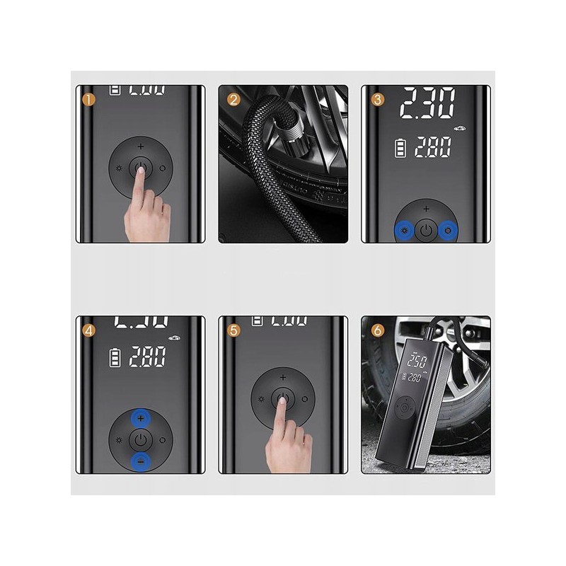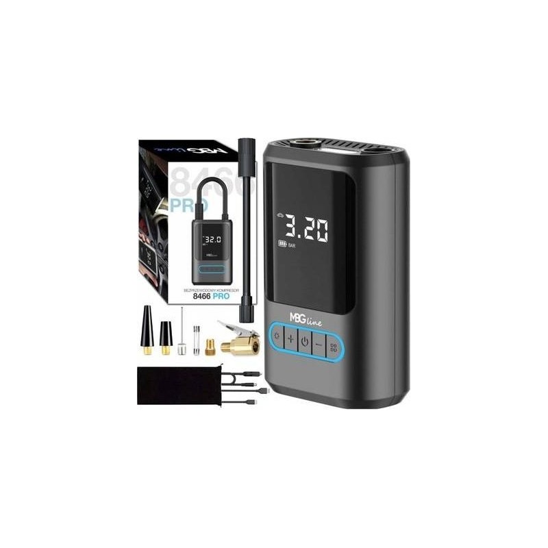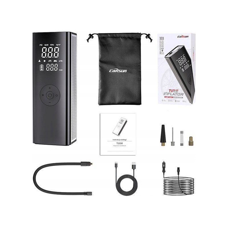 Specyfikacja technicznaMaksymalne ciśnienie: 150 PSI (10 Bar), wydajność: 35 l/min, napięcie zasilające: 12V, wbudowany akumulator 7800mAh (3.7V), ładowanie przez port USB-C.