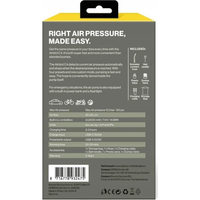 Aqiila Airbird C4 posiada inteligentny czujnik ciśnienia, który automatycznie monitoruje aktualne ciśnienie powietrza i zatrzymuje się, gdy osiągnie ustawioną wartość. Dzięki temu użytkownicy mogą być pewni, że ich opony są odpowiednio napompowane, co zwiększa bezpieczeństwo i komfort jazdy.