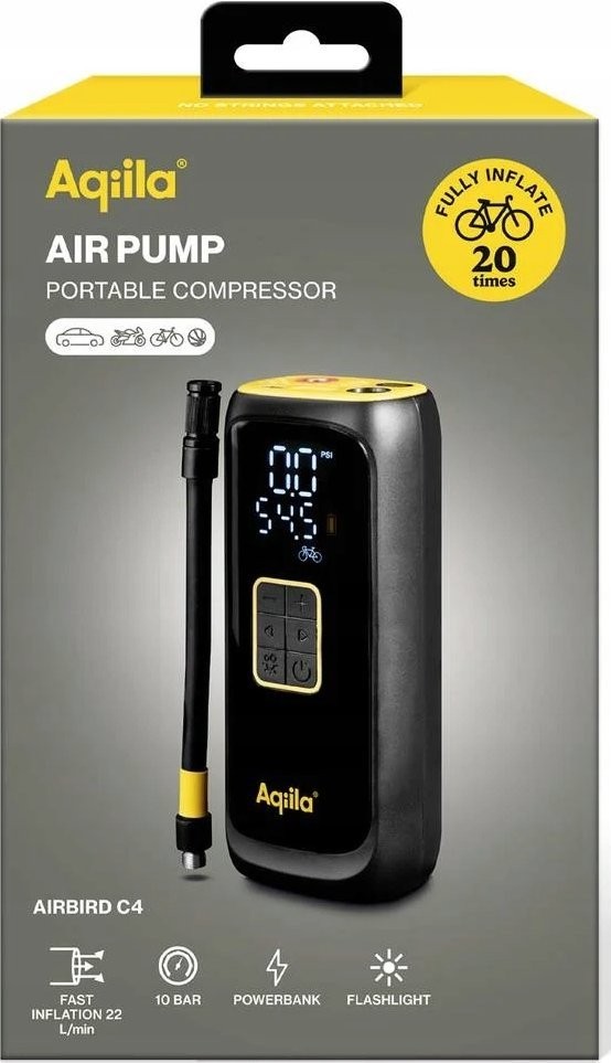 Aqiila Airbird C4 to nowoczesna, przenośna pompa powietrza, która łączy w sobie funkcje kompresora, powerbanku oraz latarki. Z maksymalnym ciśnieniem wynoszącym 10,3 bar (150 PSI) oraz przepływem powietrza w zakresie 20-22 L/min, jest doskonałym rozwiązaniem do pompowania opon rowerowych, samochodowych, motocyklowych oraz piłek. To wszechstronne urządzenie z pewnością zaspokoi potrzeby każdego użytkownika.